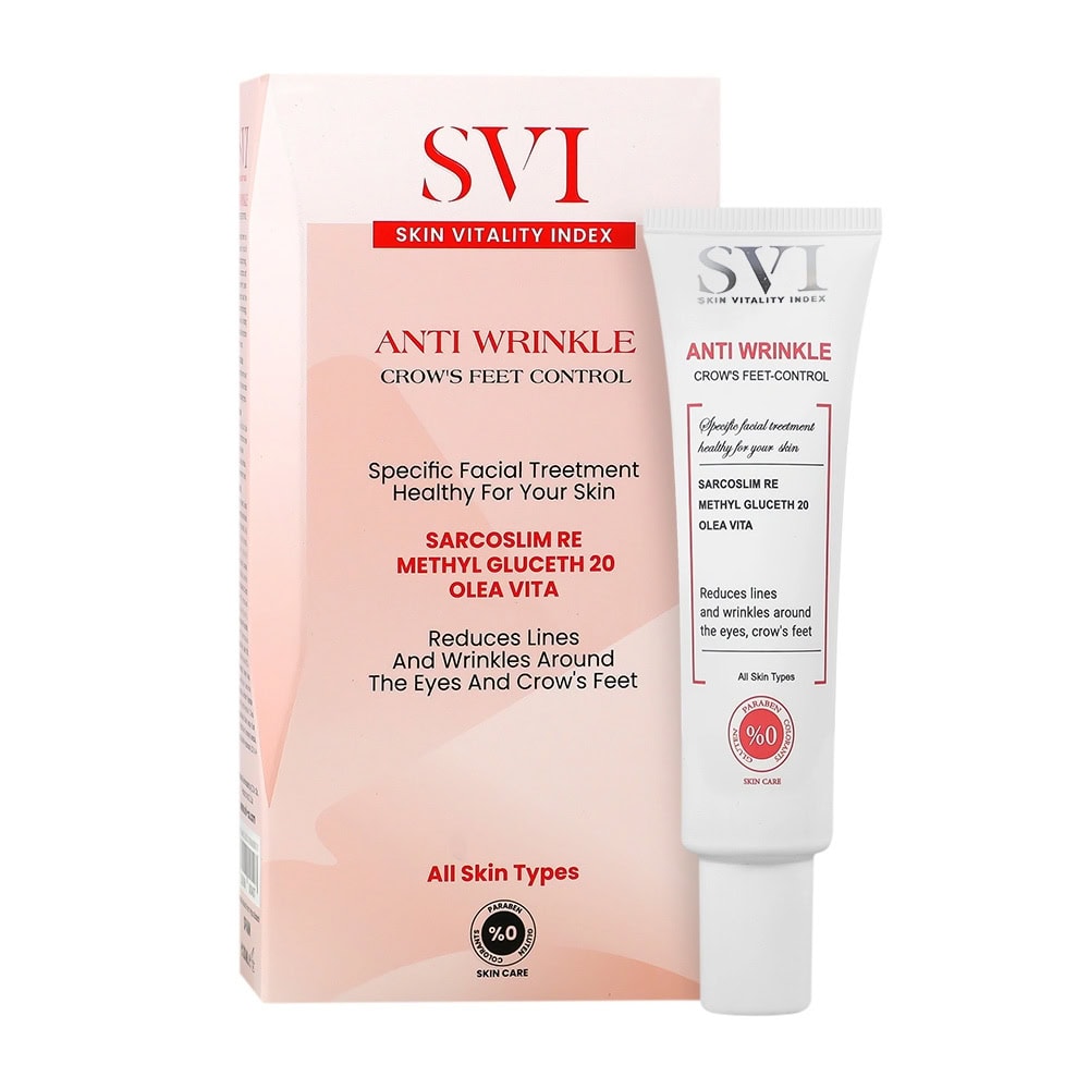 کرم اس وی آی مناسب چروک دور چشم این کرم، مناسب جهت درمان علائم پیر پوستی و خطوط پنجه کلاغی اطراف چشم می باشد که شامل مواد موثره های سارکوکاپنوس کراسسیفولیا و اولئاویتا و متیل گلوست 20 می باشد. این کرم با کاهش افتادگی و چین و چروک و خطوط ریز منجر به تحریک تولید کلاژن و الاستین و همچنین آبرسانی دور چشم می شود.