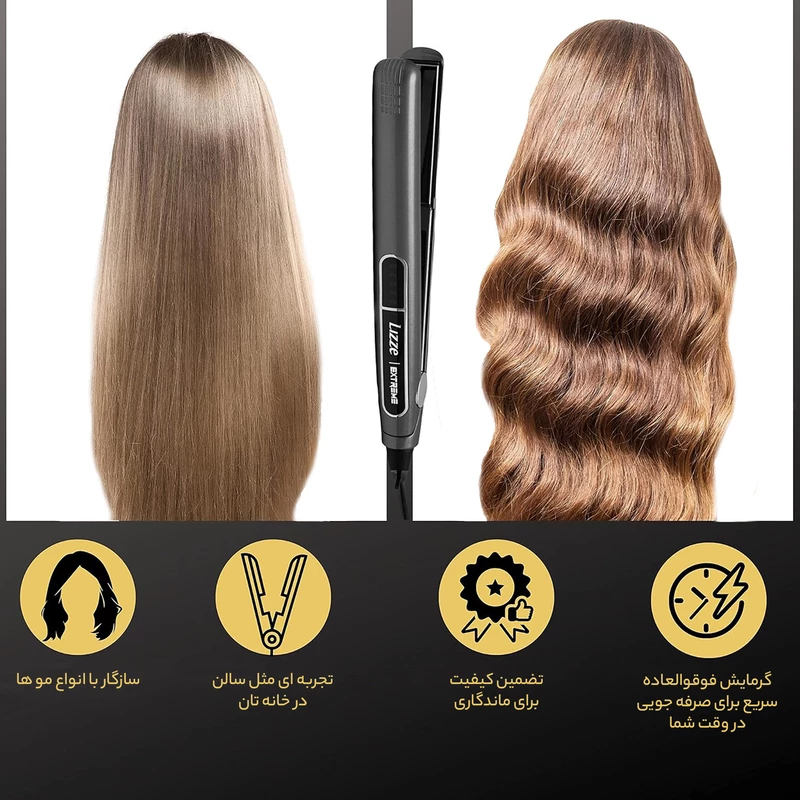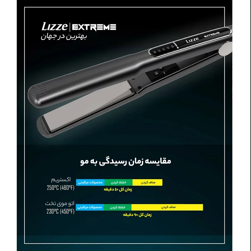 اتو مو کراتینه لیز extreme تنها اتو موی موجود در دنیاست که در مراحل اتوکشی تراپی ها از ۱۶ به ۴ مرتبه کاهش می یابد. این محصول با جدیدترین فناوری تولید شده و درخشندگی و لطافت بیشتری به مو می بخشد. همه چیز برای ایجاد راحتی و نتیجه حرفه ای بدون آسیب رساندن به سلامت موها در این اتو بررسی و تعبیه شده است. دارای مقاومت سرامیکی است که هنگام عبور از مو گرما را از دست نمی دهد و به ۲۵۰ درجه سانتیگراد می رسد ، درجه حرارت ایده آل برای افراد حرفه ای. اتو مو لیز اکستریم Lizze Extreme دارای یک سیستم گرمایشی است که هدایت حرارتی بالایی را ایجاد می کند و از طریق جایگزینی فوری حرارت ، دمای صفحه را ثابت نگه می دارد. این اتو دارای کابل چرخان به طول ۲.۵ متر میباشد. همچنین این اتو دارای صفحاتی است که از تیتانیوم پوشش داده شده است و رشته های موها را از تماس مستقیم با صفحه آلومینیوم محافظت می کند و باعث می شود روند صاف کردن سریعتر ، دقیق تر و یکنواخت شود.