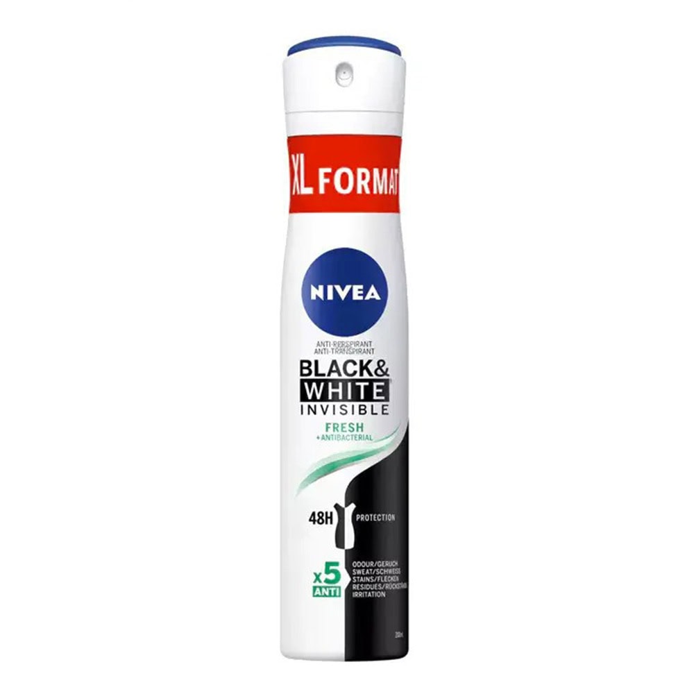 اسپری نیوآ BLACK & WHITE INVISIBLE FRESH ضد تعریق بوده و با کاهش میزان تعریق بدن از خیس شدن لباس ها و ایجاد لک های زرد و سفید روی لباس ها به خصوص در ناحیه زیر بغل جلوگیری می کند و از ایجاد احساس چسبندگی روی پوست جلوگیری می کند.