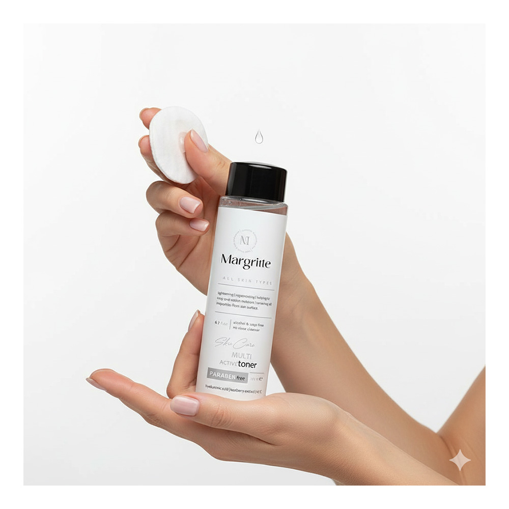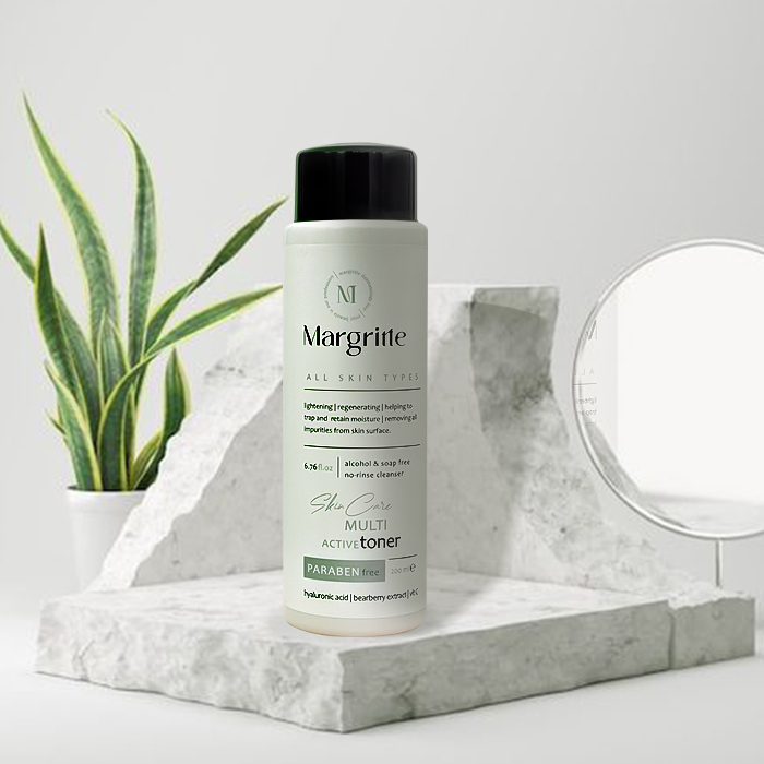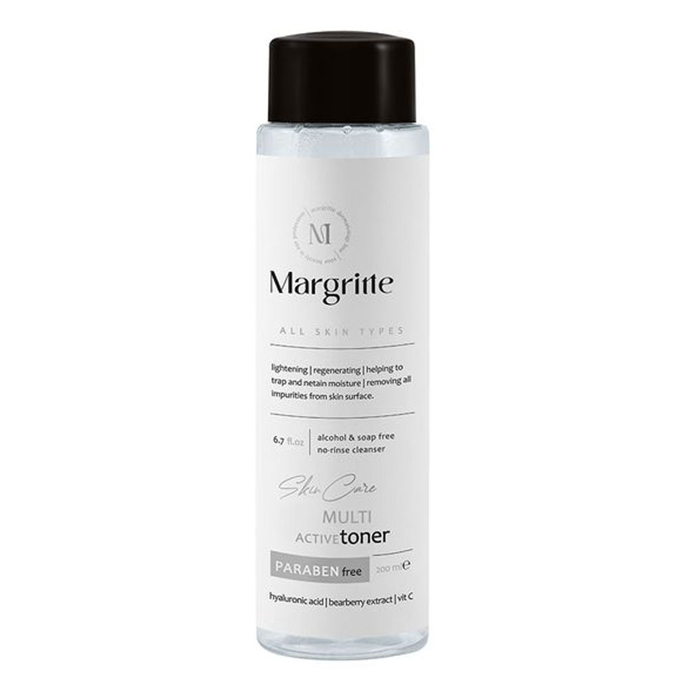 تونر پاک کننده انواع پوست مارگریت یک محصول مراقبت از پوست چند منظوره است که ضمن پاکسازی مؤثر آلودگیها و بقایای آرایش، با داشتن عصارههای طبیعی همچون لیکوریس، بیر بری، آلوئهورا و سائوپالمتو باعث شفاف شدن رنگ پوست، آبرسانی عمیق و افزایش لطافت میگردد. فرمولاسیون ملایم و بدون الکل، پارابن و مواد صابونی این تونر، آن را به انتخابی مناسب برای انواع پوست حتی پوستهای حساس تبدیل کرده است.تونر روشن کننده مولتی اکتیو مارگریت دارای ترکیبات بسیار ایمن، غیر کومدون زا و غیر محرک پوست است. ترکیبات این تونر به گونه ای طراحی شده که تمامی تیپ های پوستی، حتی پوست های بسیار حساس نیز می توانند با خیالی آسوده از آن استفاده کنند.