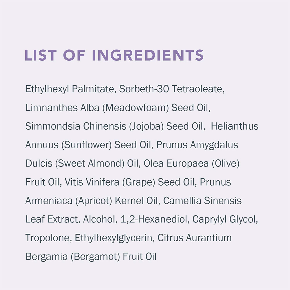 حاوی 6 روغن گیاهی (میوه ترنج، دانه میدوفوم، دانه جوجوبا، دانه آفتابگردان، بادام شیرین و زیتون) جهت پاکسازی، آبرسانی و تغذیه پوست