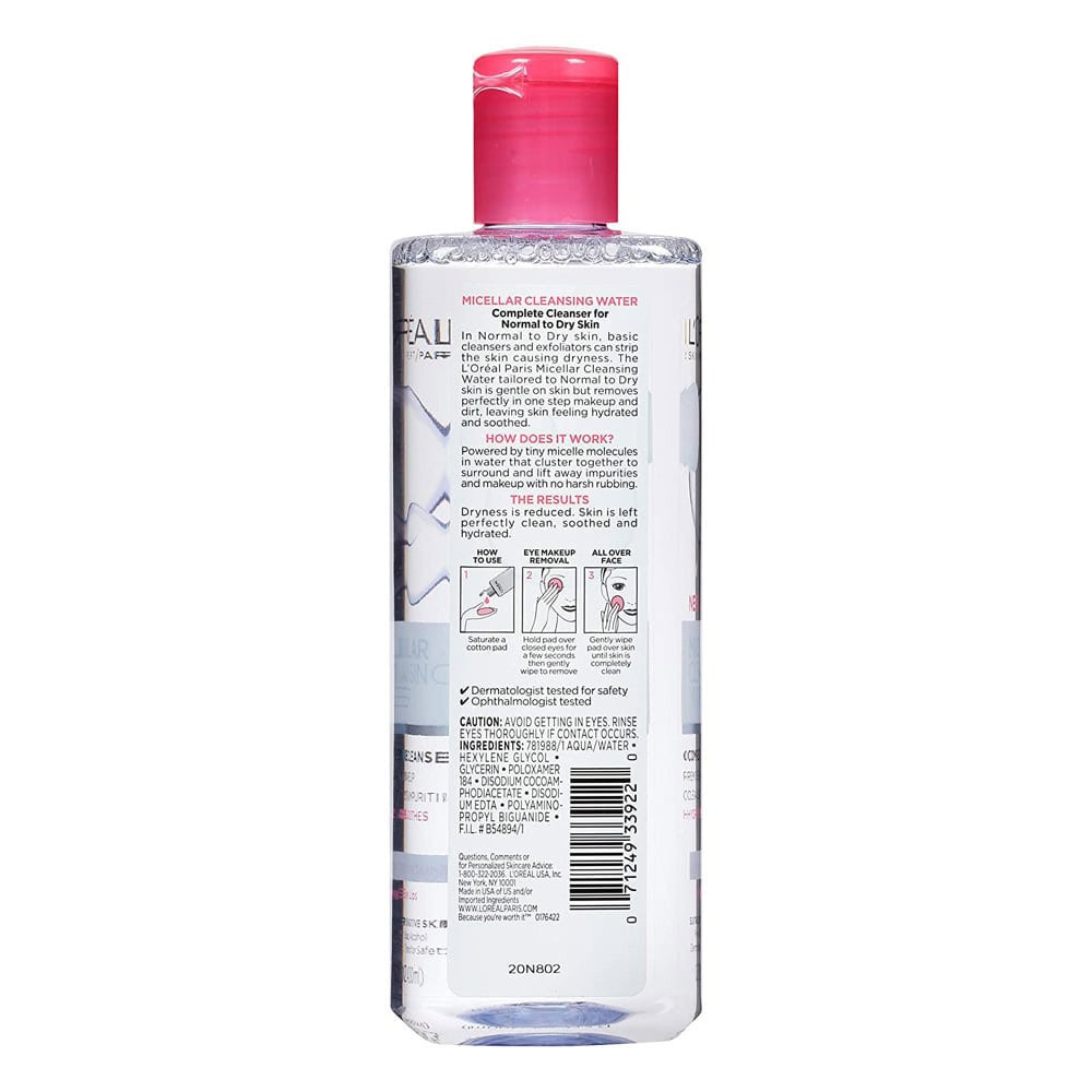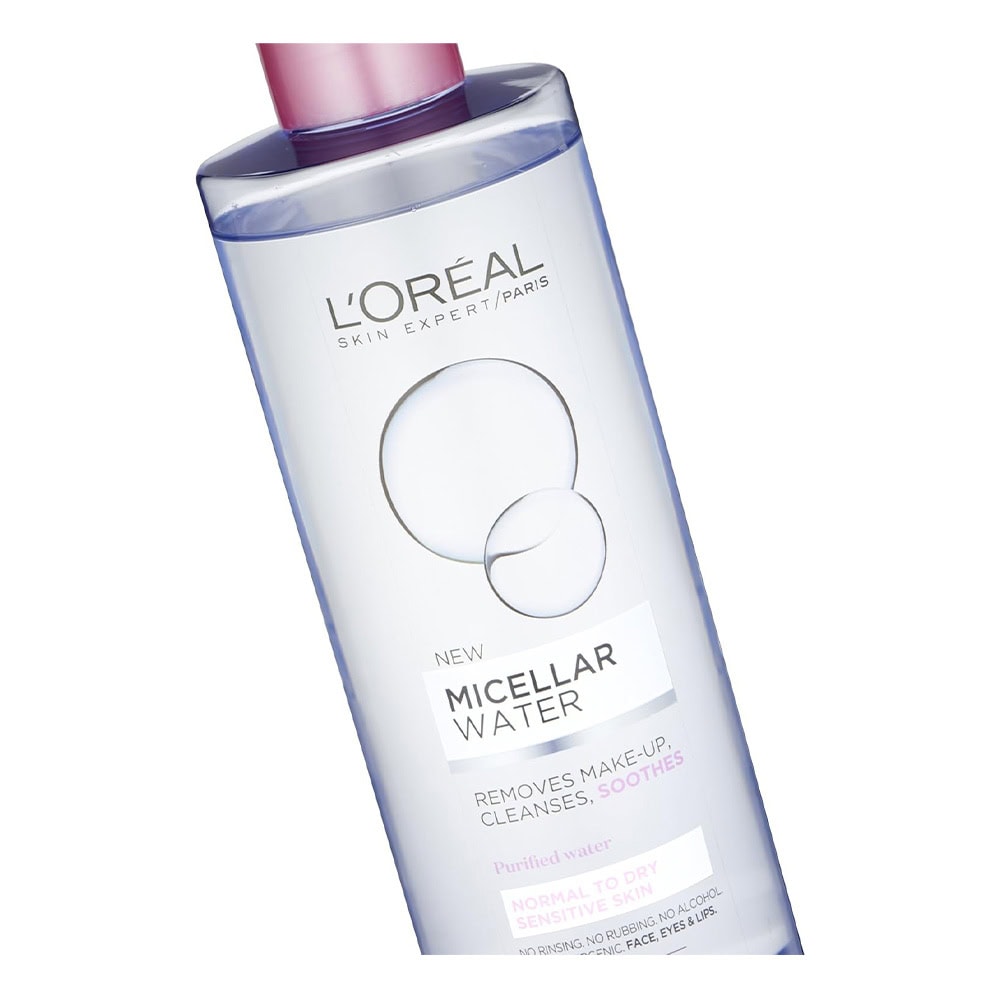 میسلار واتر لورآل پوست نرمال و خشک L’Oreal Paris تنها با یک حرکت به طور موثر آرایش را پاک می کند ، پوست را پاکسازی و تسکین می دهد ، مناسب برای پوست های معمولی، خشک و حساس ، در این پاک کننده آرایش، آب تصفیه شده طی فرآیند تصفیه آب پیشرفته استخراج شده و با میسل هایی ترکیب می شود که کثیفی روی صورت را جمع می کند ، این پاک کننده پاکسازی موثر و ملایم پوست صورت را فراهم می کند که حتی برای حساس ترین پوست ها نیز مناسب است ، ضد حساسیت – بدون عطر – بدون الکل. تست شده زیر نظر متخصصین پوست و چشم تولید شده است.