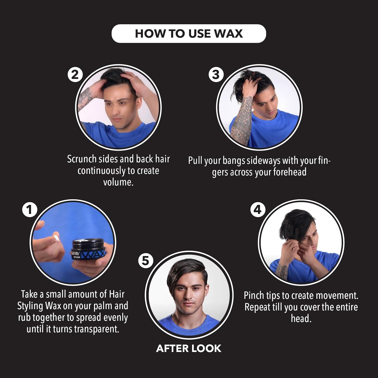 مقداری از واکس را کف دستها گرم کرده و روی موهای خشک یا نیمهمرطوب پخش کنید. با انگشتان خود مدل دلخواه را ایجاد کنید و در صورت نیاز، در طول روز مجدد حالت دهید.