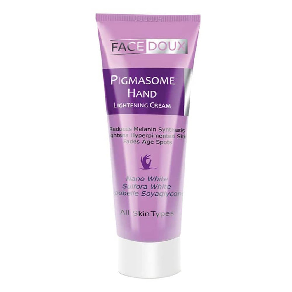 کرم دست ضد لک پیگمازوم فیس دوکس به کاهش لکه های پوست دست در حجم 50 میلی لیتر تولید شده است. لکه های پوستی به علت تجمع رنگدانه ها و ملانین در سطح پوست به دلیل عوامل ارثی و محیطی مانند نور آفتاب، اشعه های مضرر، افزایش سن و… ایجاد می شود. لاین پیگمازوم از برند فیس دوکس برای جلوگیری و کاهش ایجاد لک های پوستی طراحی شده است. کرم دست ضد لک پیگمازوم باعث روشن تر شدن پوست شده و می تواند موجب برطرف شدن لکه های پوستی شود.این کرم خاصیت آنتی اکسیدان دارد و با دارا بودن ویتامین ها و مواد ضد چروک و مواد طبیعی باعث کاهش تیرگی های پوستی و روشن شدن آن ها می شود.