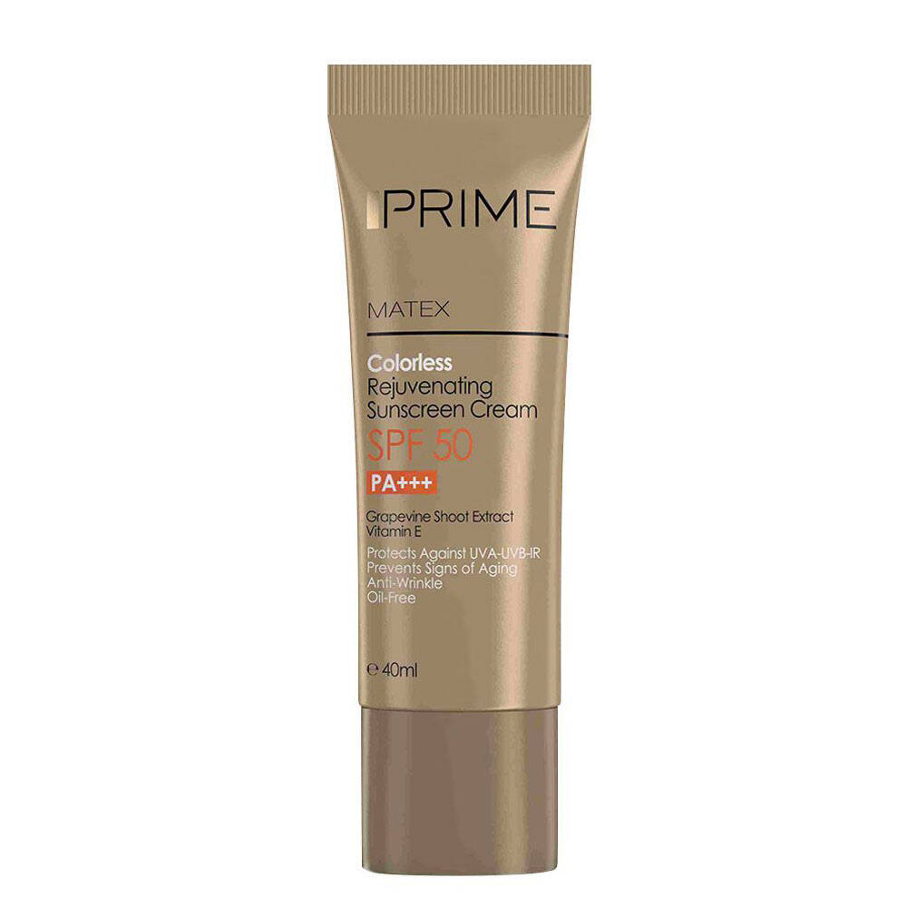 کرم ضد آفتاب بی رنگ جوان کننده پرایم SPF50 از طریق مکانیسمی شبه بوتاکس و شبه رتینوئیدی توسط عصاره معجزه آسا تاک چین و چروک های ایجاد شده روی پوست را از بین می برد و مانع از به وجود آمدن دوباره آن ها می شود. این محصول سرشار از ویتامین E با خواص آنتی اکسیدانی قوی است که یک ضد چروک و مرطوب کننده مناسب نیز به حساب می آید. ضد آفتاب جوان کننده پریم از پوست در برابر اشعه های UVA، UVB، IR محافظت می کند. همچنین این ضد آفتاب سریع جذب می شود و می توانید از آن به عنوان پایه آرایش هم استفاده کنید.ضد آفتاب پرایم با قابلیت پوشانندگی لک های سطحی پوست، دارای ترکیبات فعال مانند فیلترهای UV، عصاره ی تاک، ویتامین می باشد. این کرم ضد آفتاب سریع جذب می شود و می توانید از آن به عنوان یک پایه آرایش نیز استفاده کنید. از آنجایی که این ضد آفتاب حاوی رنگدانه می باشد.