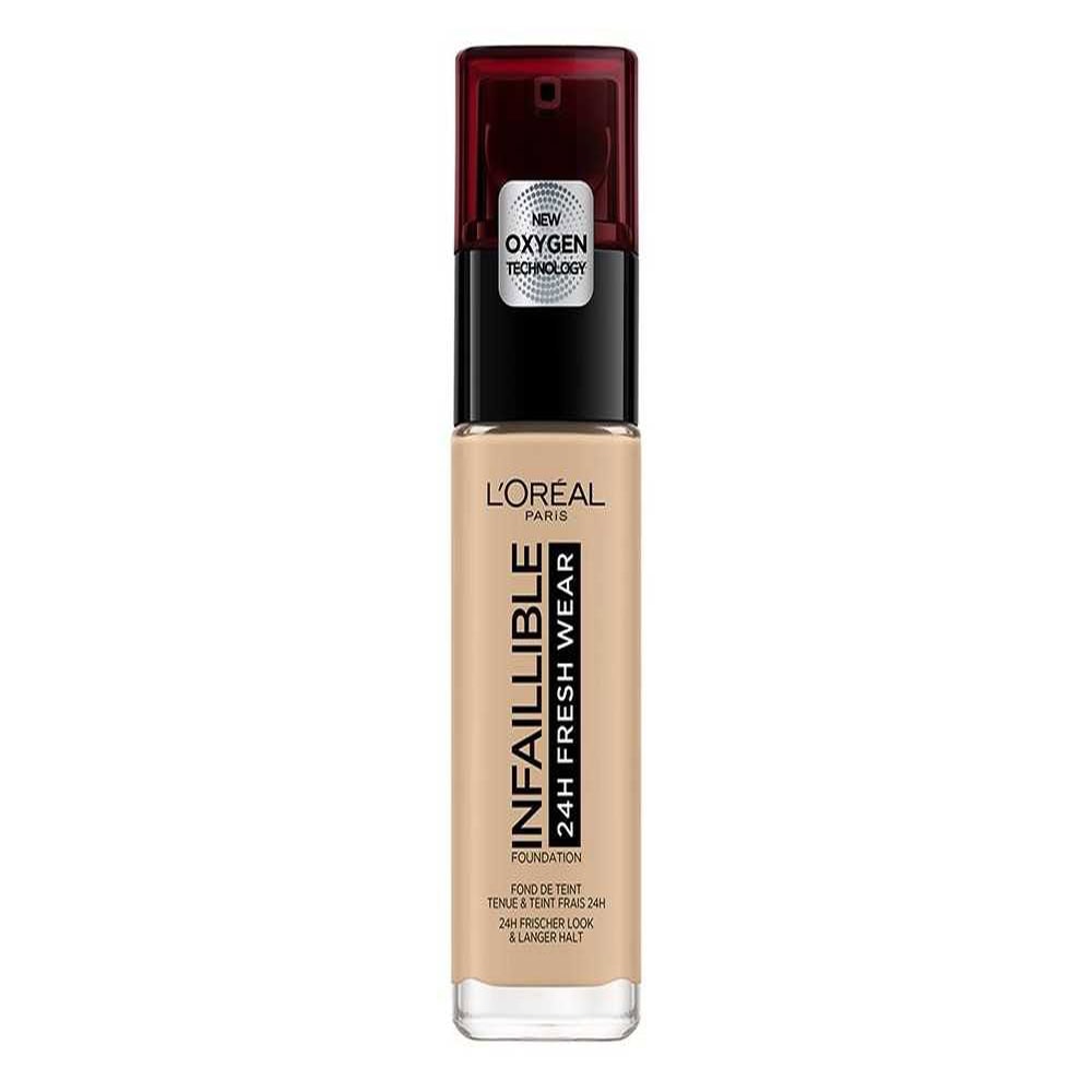 کرم پودر 32 ساعته اینفالیبل FRESH WEAR لورال کرم رطوبت پوست را در طول روز تامین کرده و به دلیل دارا بودن SPF 25، پوست را در برابر اشعه ماوارءبنفش محافظت میکند. این محصول، دارای میکرو مرواریدهای منعکس کننده نور است که ظاهری درخشان به پوست داده و آن را شاداب و با طراوت نشان میدهند. فرمول این کرم پودر در برابر آب و تعریق مقاوم است.